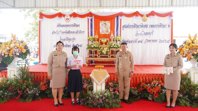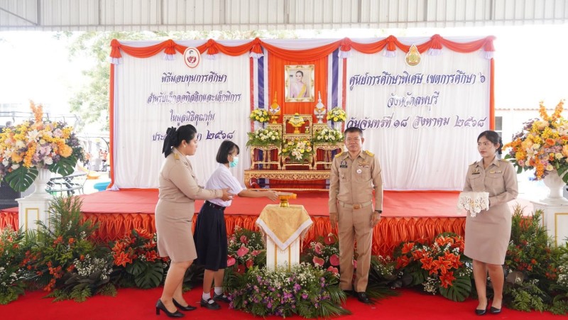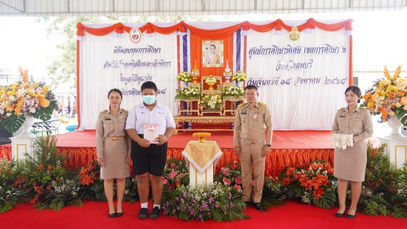 วันที่ 18 สิงหาคม 2568 เวลา 9.00 น. นายอรรถพงษ์ พลนิกร ผู้อำนวยการโรงเรียน พร้อมด้วยนายชนะ ผลบุญ รองผู้อำนวยการฝ่ายบริหารงานวิชาการ และคณะครู นำตัวแทนนักเรียน เข้ารับมอบทุนการศึกษา จำนวนทุนละ 5,000 บาท จำนวน 2 ทุน ในพิธีประทานทุนสนับสนุนการศึกษาเด็กออทิสติกและเด็กพิการมูลนิธิคุณพุ่ม ในทูลกระหม่อมหญิงอุบลรัตนราชกัญญา สิริวัฒนาพรรณวดี มอบทุนสนับสนุนการศึกษาแก่เด็กออทิสติก และเด็กพิการ ในปีการศึกษา 2568 รวมจำนวน 111 ทุน โดยมีนายปรัชญา เปปะตัง รองผู้ว่าราชการจังหวัดลพบุรี เป็นประธานในพิธีมอบทุนสนับสนุนการศึกษามูลนิธิคุณพุ่ม เพื่อเป็นการช่วยเหลือเด็กพิเศษดังกล่าวที่ครอบครัวมีฐานะยากจน ให้ได้รับการพัฒนาสมรรถภาพทางร่างกายและจิตใจ สามารถช่วยเหลือตนเองได้ และได้รับโอกาสทางการศึกษาเท่าเทียมกับเด็กปกติทั่วไป ณ ศูนย์การศึกษาพิเศษ เขตการศึกษา 6 จังหวัดลพบุรี (ภาพ: ครูวีระพงษ์/ คัดเลือกภาพ-ออกแบบ: ครูทิวาภรณ์/ ข่าว-เผยแพร่: ครูศิริวดี)