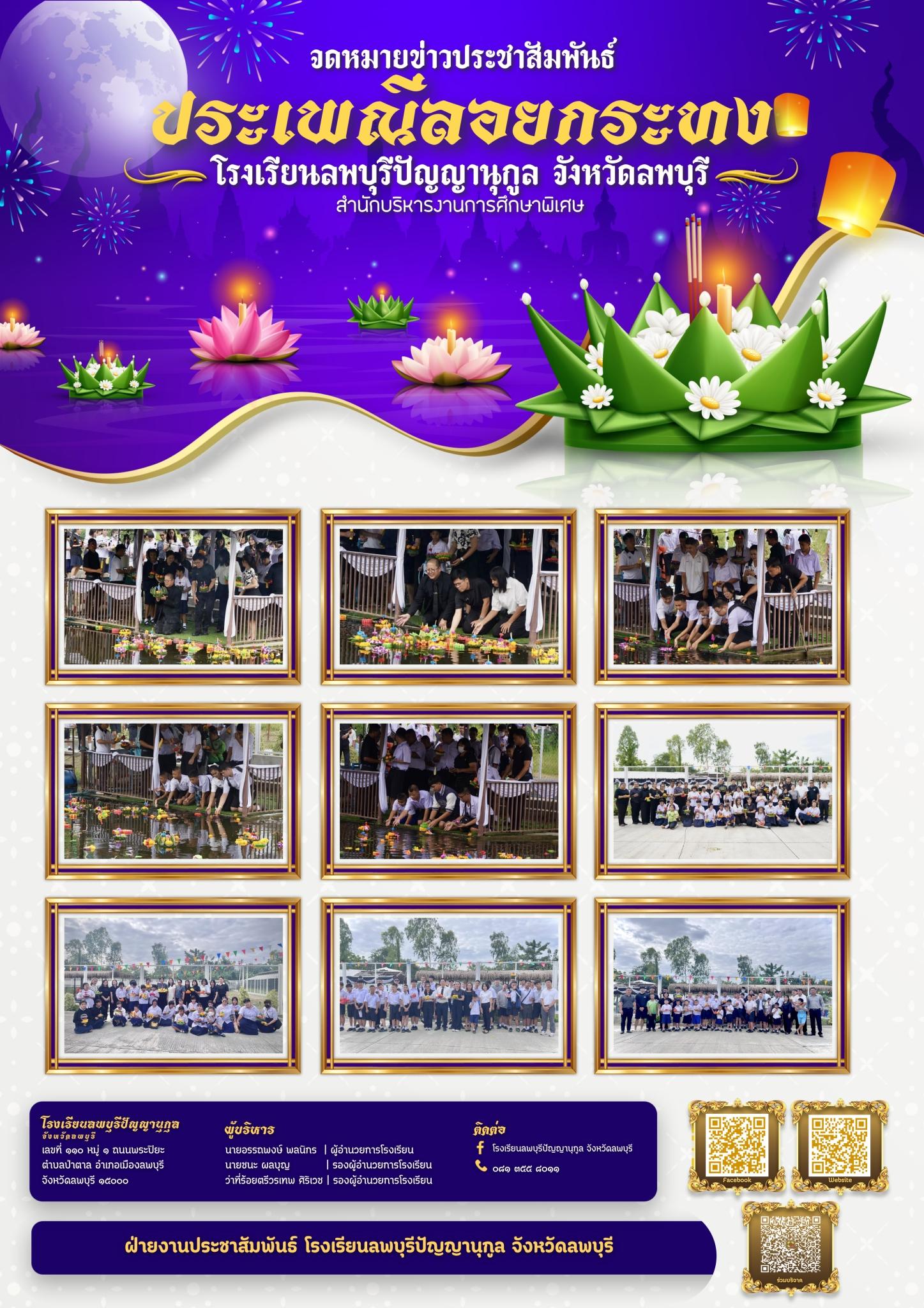 | วันที่ 5 พฤศจิกายน 2568 โรงเรียนลพบุรีปัญญานุกูล จังหวัดลพบุรี จัดกิจกรรมวันลอยกระทง ประจำปีการศึกษา 2568 โดยได้รับเกียรติจาก นายอรรถพงษ์ พลนิกร ผู้อำนวยการ เป็นประธานในพิธี, นายชนะ ผลบุญ รองผู้อำนวยการฝ่ายบริหารงานวิชาการ เป็นผู้กล่าวรายงาน คณะครู บุคลากร และนักเรียนเข้าร่วมกิจกรรมร่วมกัน โดยจัดกิจกรรมแบบบูรณาการการเรียนรู้ตลอดทั้งวัน ได้แก่ กิจกรรมการจัดทำกระทงระหว่างผู้บริหาร ครู และนักเรียนตามเรือนนอน และลอยกระทง เพื่อเป็นการสืบสานวัฒนธรรม ประเพณีอันดีงามของไทย ให้ผู้เรียนเรียนรู้วิธีการทำกระทงจากวัสดุธรรมชาติ และเพื่อให้ตระหนักถึงความสำคัญของแม่น้ำคงคา รวมทั้งมีการร่วมยืนสงบนิ่ง เพื่อแสดงความอาลัยถวายแด่สมเด็จจพระนางเจ้าสิริกิติ์ พระบรมราชินีนาถ พระบรมราชนนีพันปีหลวง ณ อาคารอเนกประสงค์ 2 และสระน้ำบ่อปลา โรงเรียนลพบุรีปัญญานุกูล จังหวัดลพบุรี (ภาพ: ครูเวทางค์, ครูไข่มุก/คัดเลือกภาพ-ออกแบบ: เวทางค์ ครูสุภาวดี/ข่าว-เผยแพร่: ครูศิริวดี) |