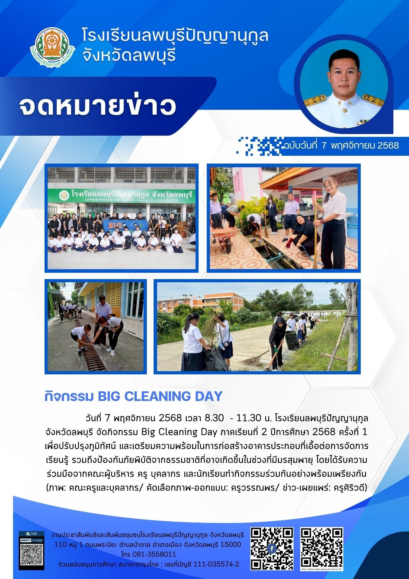 | วันที่ 7 พฤศจิกายน 2568 เวลา 8.30 - 11.30 น. โรงเรียนลพบุรีปัญญานุกูล จังหวัดลพบุรี จัดกิจกรรม Big Cleaning Day ภาคเรียนที่ 2 ปีการศึกษา 2568 ครั้งที่ 1 เพื่อปรับปรุงภูมิทัศน์ และเตรียมความพร้อมในการก่อสร้างอาคารประกอบที่เอื้อต่อการจัดการเรียนรู้ รวมถึงป้องกันภัยพิบัติจากธรรมชาติที่อาจเกิดขึ้นในช่วงที่มีมรสุมพายุ โดยได้รับความร่วมมือจากคณะผู้บริหาร ครู บุคลากร และนักเรียนทำกิจกรรมร่วมกันอย่างพร้อมเพรียงกัน (ภาพ: คณะครูและบุคลากร/ คัดเลือกภาพ-ออกแบบ: ครูวรรณพร/ ข่าว-เผยแพร่: ครูศิริวดี) |
